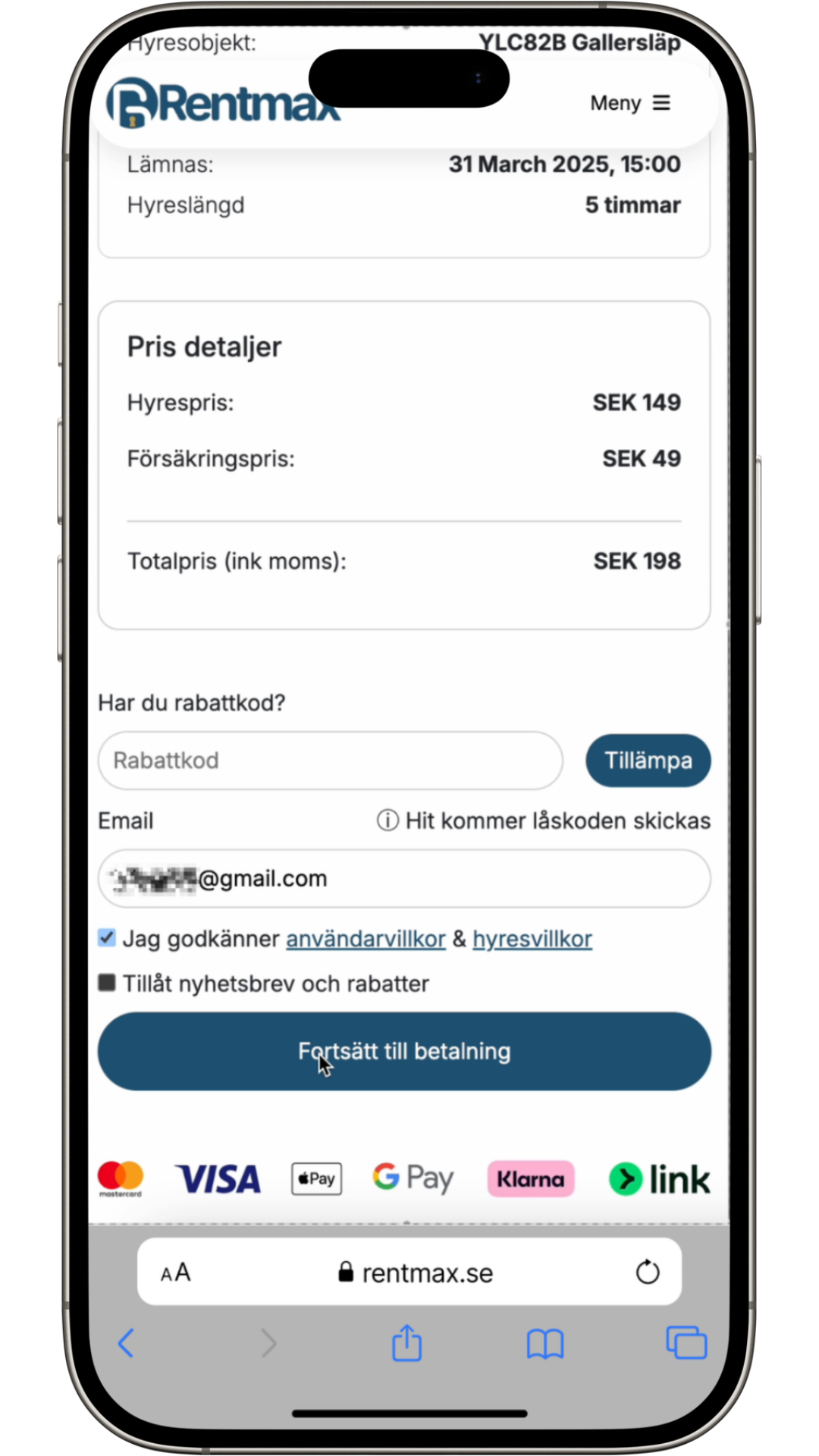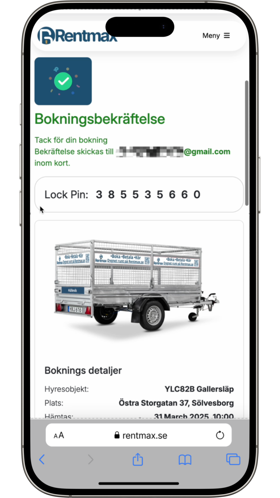 Vi skickar en PIN-kod som används för att låsa upp släpet.